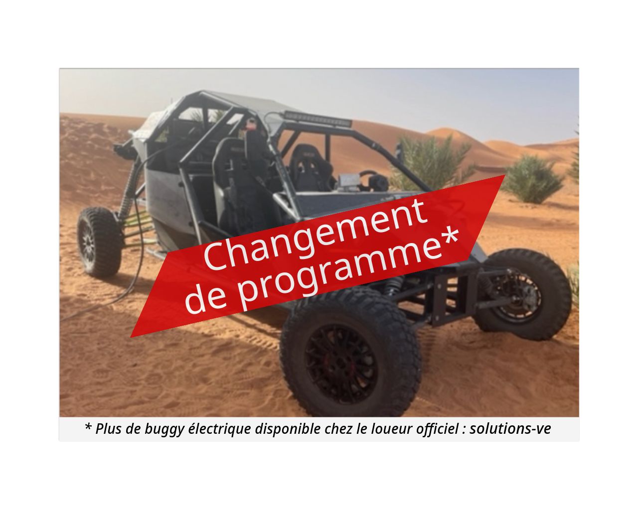 C'est avec regret que nous vous annonçons le changement de programme concernant le buggy électrique du loueur officiel Solutions-VE du Rallye Aïcha des Gazelles.